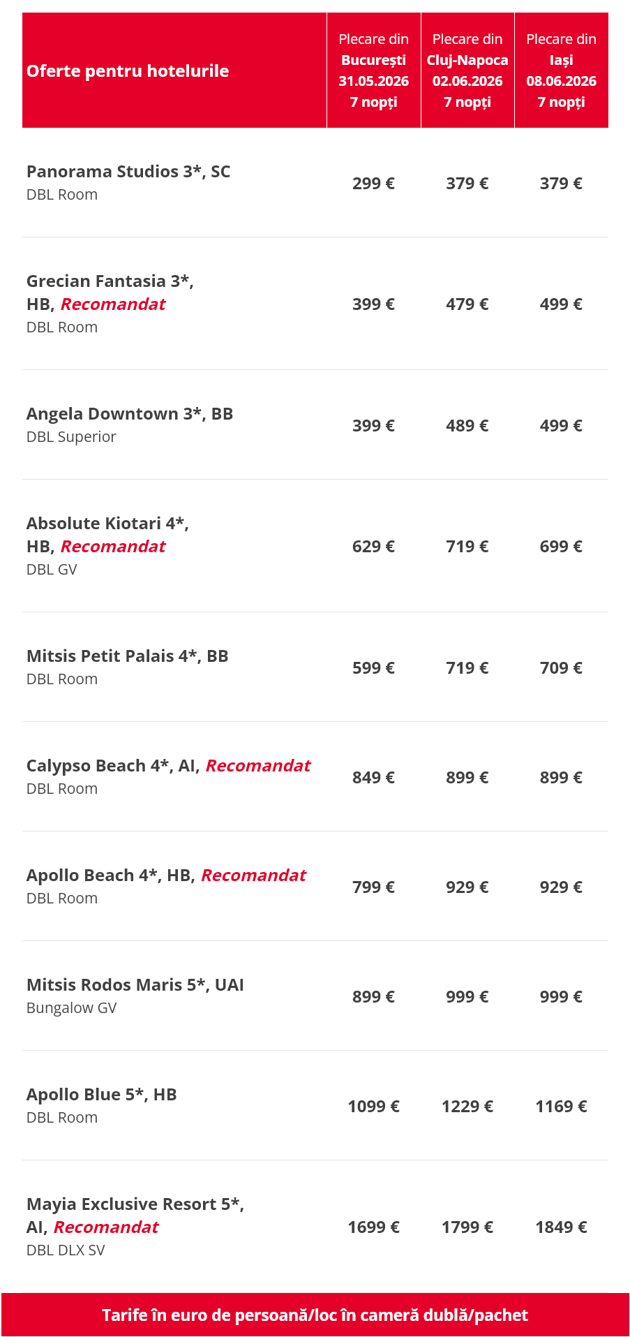 OBSERVATII: tarifele pot suferi modificari din cauze independente de agentia noastra;