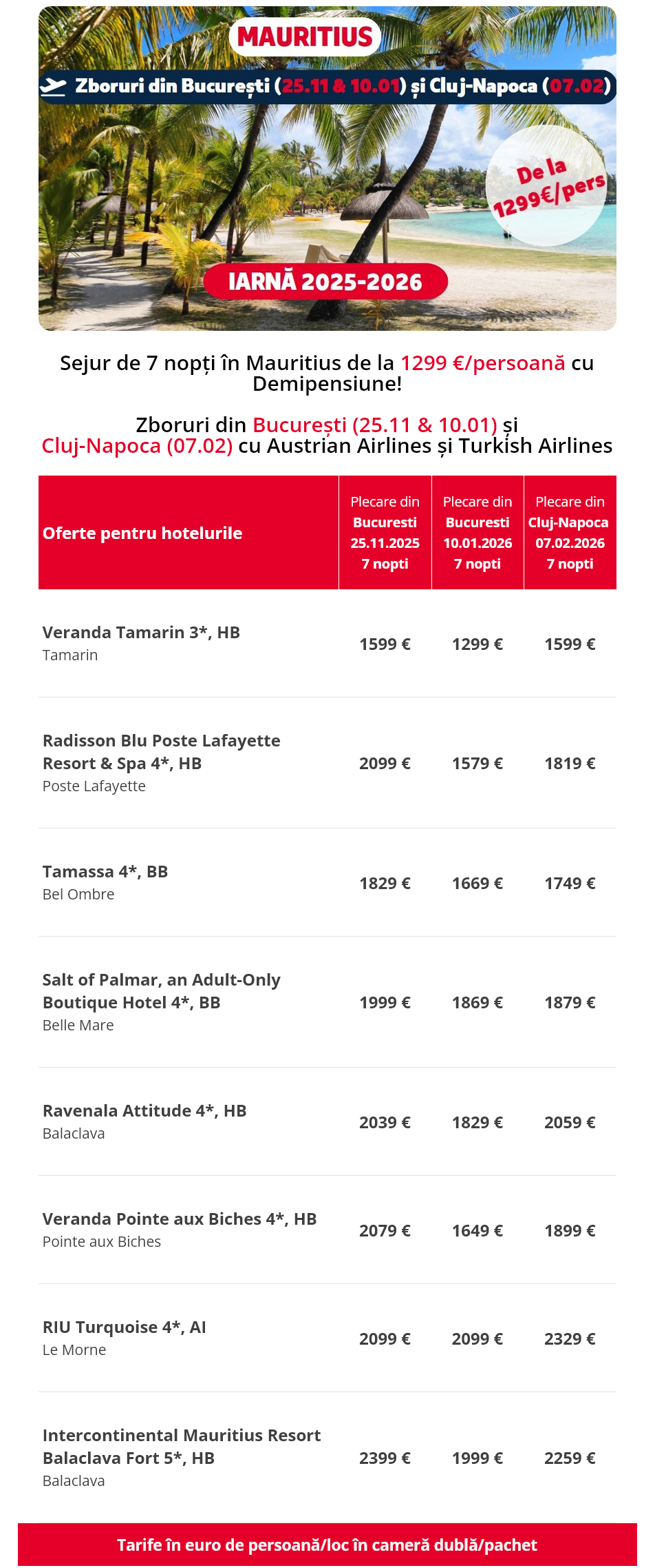 - Transport avion compania Austrian Airlines si Turkish Airlines: Bucuresti – Mauritius – Bucuresti, via Viena/ Istanbul