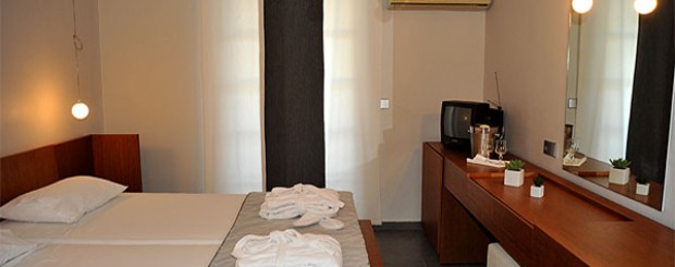 Facilitati camere Hotel Afroditi Venus Beach: aer conditionat, TV satelit, frigider, muzica, telefon direct, seif, uscator de par, halate de baie, papuci de baie, prosoape pentru baie, baie cu cada, balcon sau terasa cu vedere la munte sau la piscina.