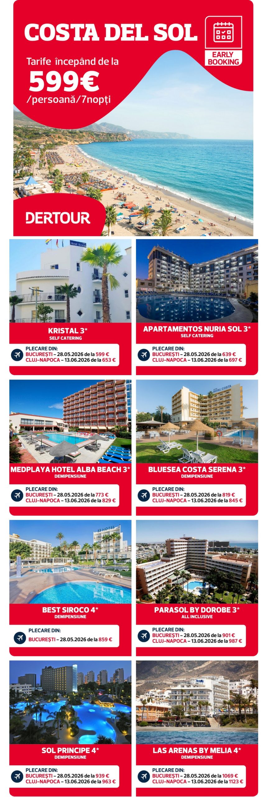 In fiecare zi apar oferte speciale sau oferte last minute la diferite programe turistice, Charter Costa del Sol sau alte programe Charter Spania; pentru a beneficia de cea mai buna oferta turistica actualizata privind un pachet Charter Spania Costa del Sol 2024, contactati agentia de turism All Inclusive Travel.