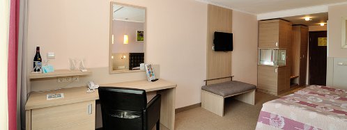 Dotari camera: baie, WC, telefon, radio, televizor cu program prin satelit, aer conditionat si posibilitate de instalare a celui de-al treilea pat.