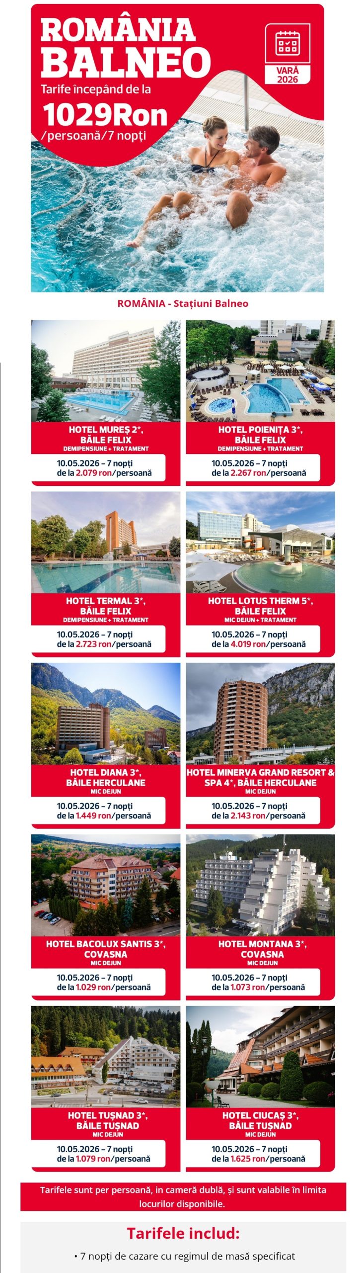 In fiecare zi apar oferte speciale sau oferte last minute la diferite programe turistice, cum ar fi decada balneara, iar pentru a beneficia de cea mai buna oferta turistica actualizata privind cateva oferte balneo Romania, contactati agentia de turism All Inclusive Travel.